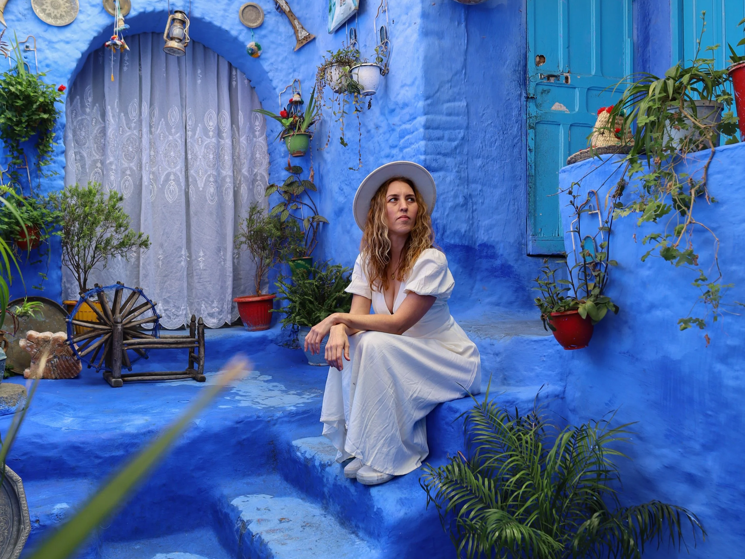 Sitting in a blue corner in Chefchaouen, Morocco’s blue city.