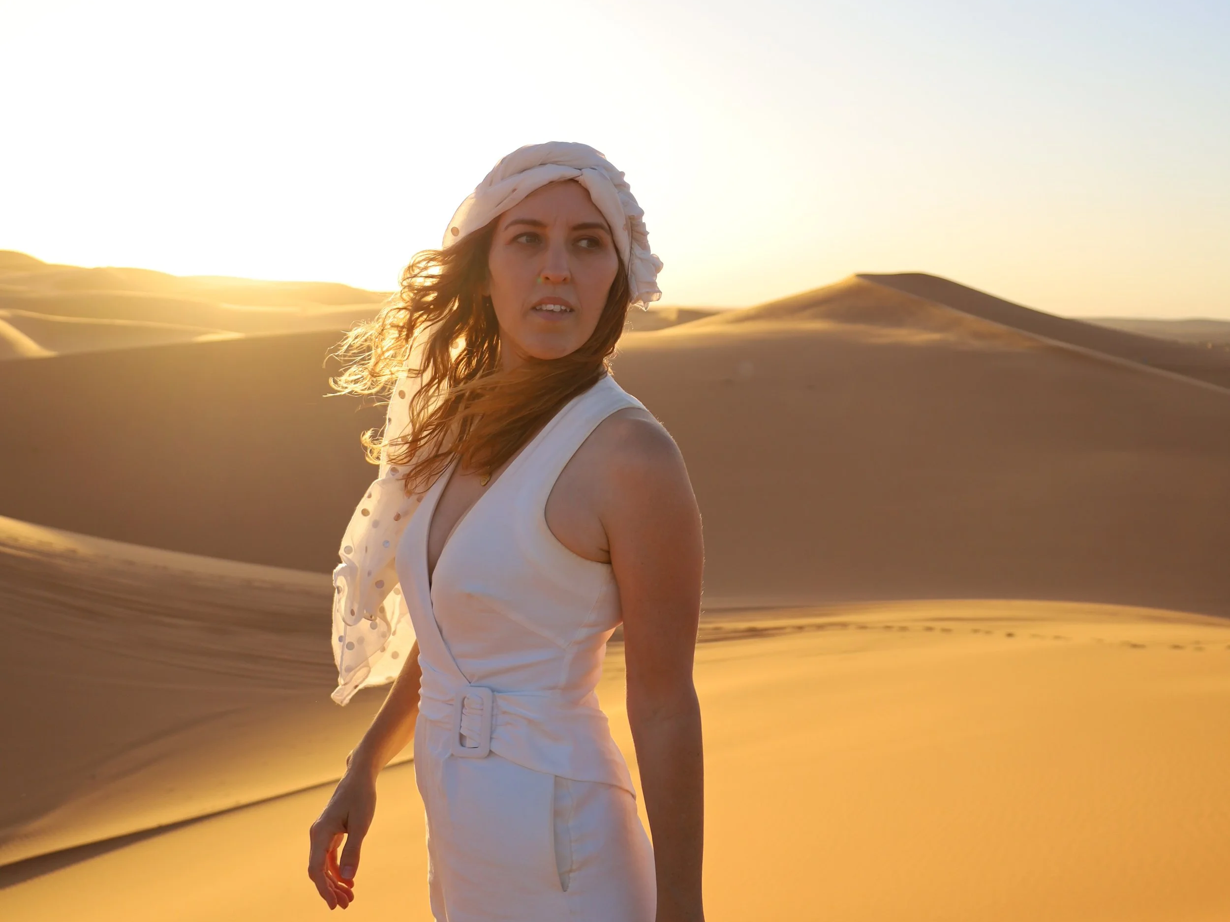 My fave white playsuit and white (and gold) scarf in the Sahara Desert, Morocco. Works for almost any backdrop.