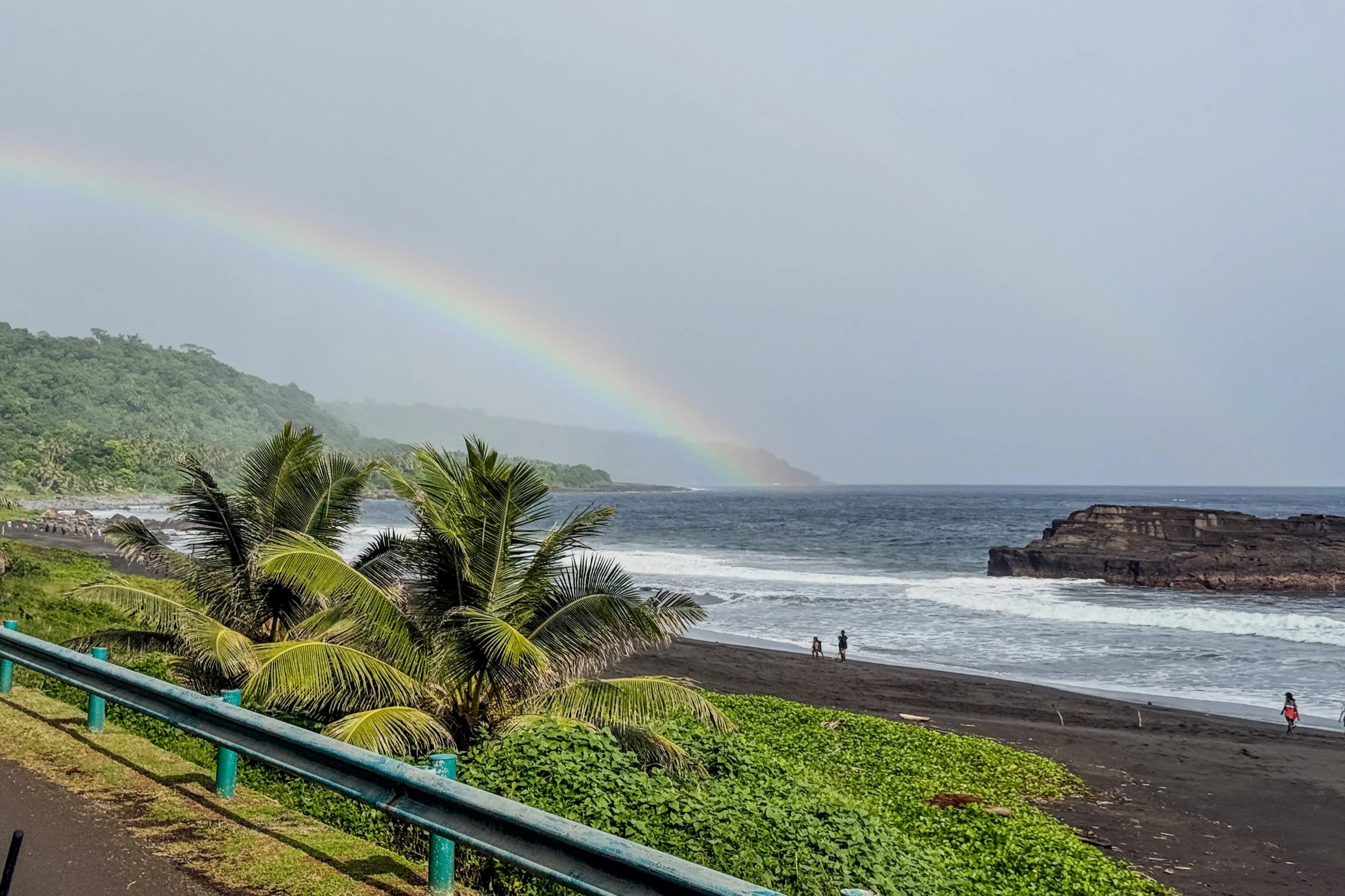 The drive around the island to reach Mount Yasur was more beautiful (and bumpy) than we’d expected. We arrived late afternoon and headed straight to the volcanic ash plain. The landscape was a striking contrast of greens, dark volcanic ash, and flowing water from the rain that hit late in the afternoon. It felt like another world.