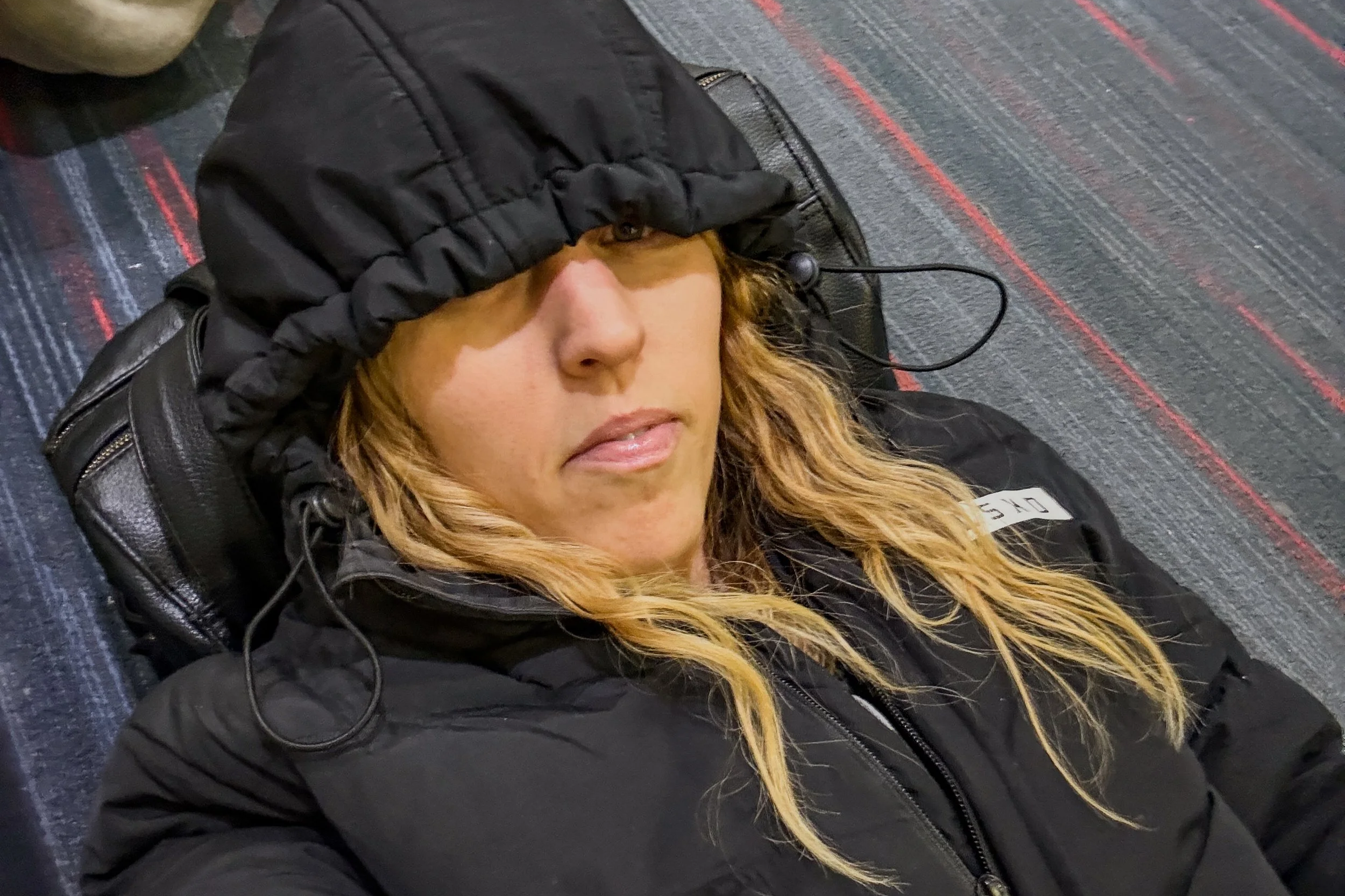 Attempting to sleep on the cold airport floor in Dallas during the snowstorm.
